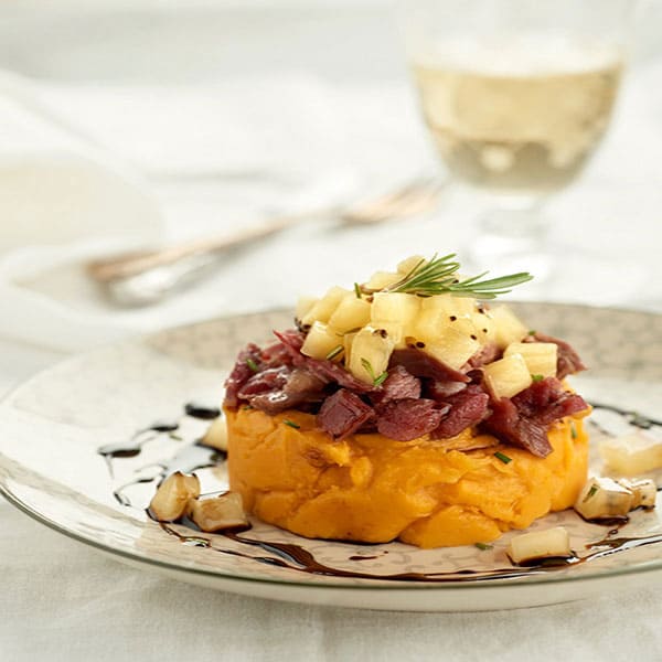 - Till purén: ugnsrosta sötpotatisen och löken i 45–50 minuter, tills de är mjuka. Vänta tills de har svalnat och skala dem. Lägg dem i mixern tillsammans med olivolja, salt, peppar och muskotnöt och mixa ihop. Ställ åt sidan.