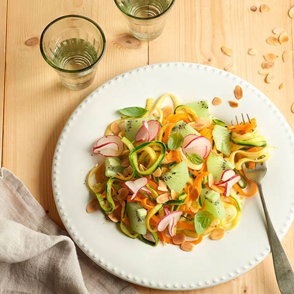 Zucchini- och morotsspaghetti med green kiwifrukt