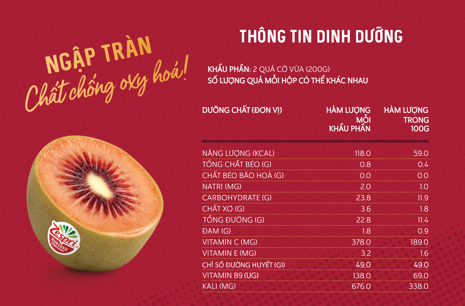 Với phần ruột đỏ rực rỡ cùng hương vị ngọt ngào hấp dẫn như quả mọng, Zespri RubyRed™ Kiwifruit giàu chất chống oxy hóa và là món ngon khó cưỡng, yêu chiều bạn theo cách tự nhiên nhất.
